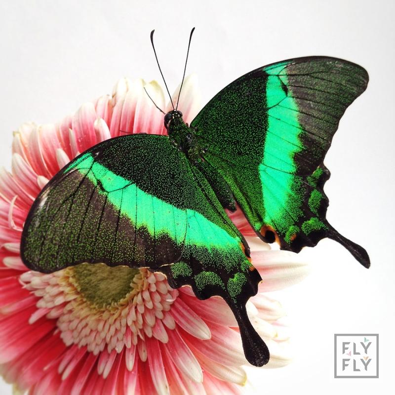 Размах крыльев до 12 см. Основной цвет крыльев - черный, с яркими малахитовыми полосами и точками. Полет быстрый. Идеальна как для салютов, так и в качестве подарка сама по себе. Живет до полутора недель.