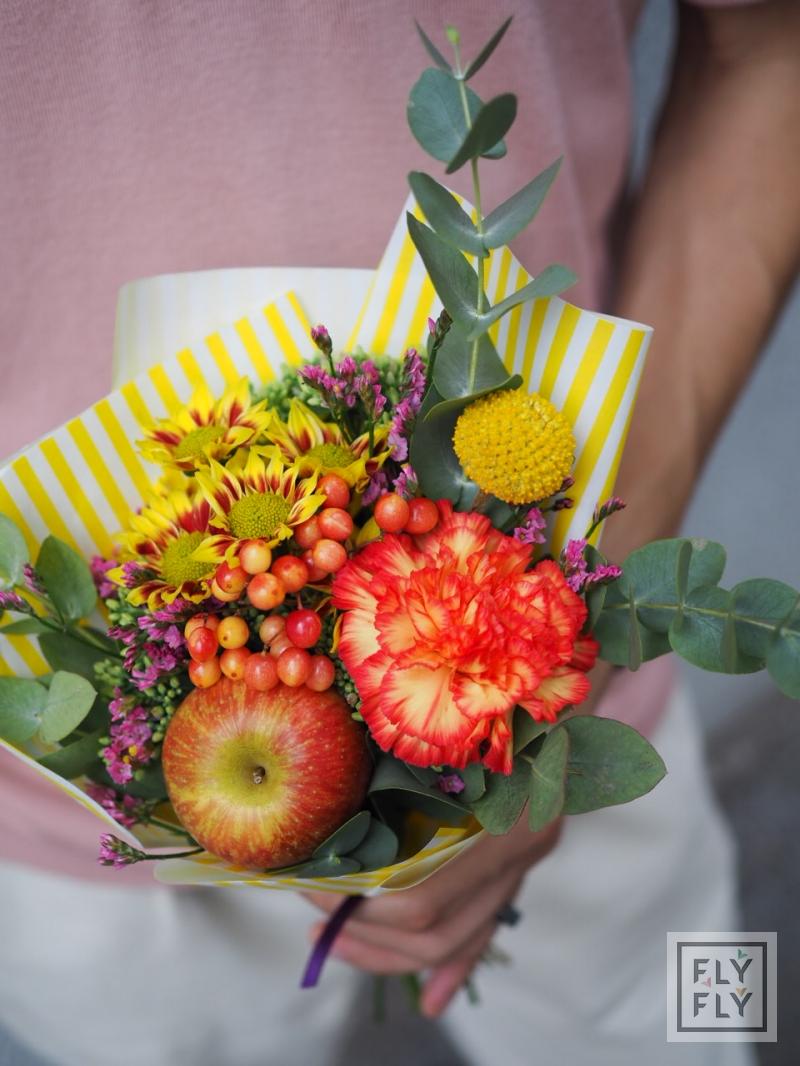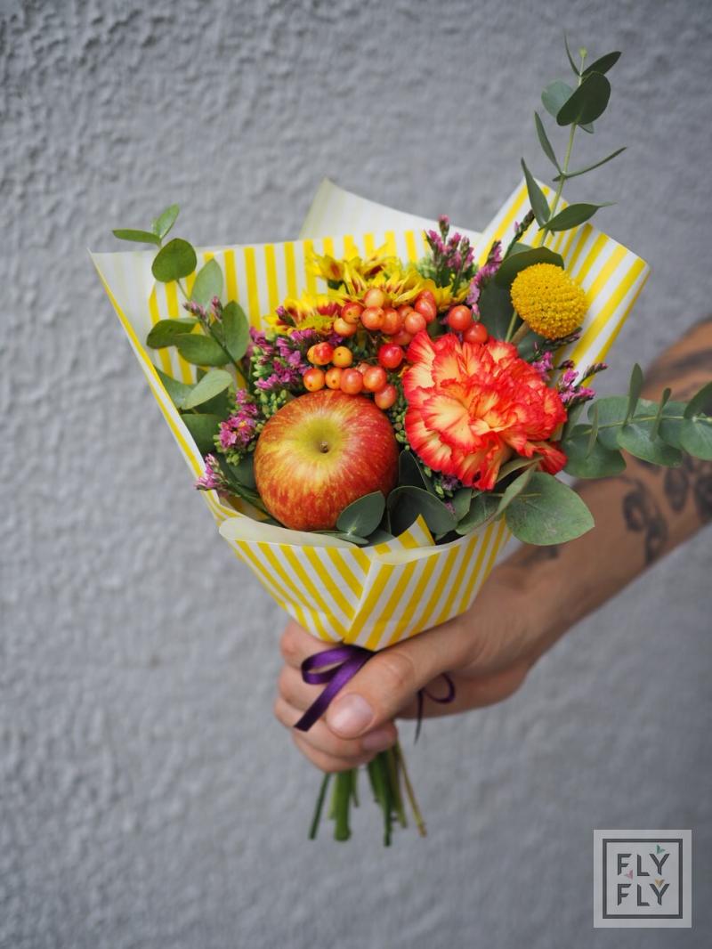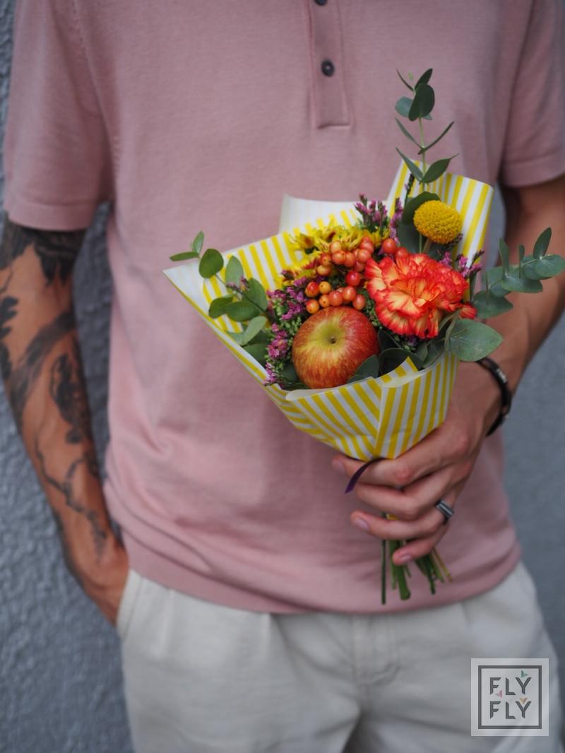 В составе: диантус, яблоко, краспедия, хризантема кустовая, лимониум, седум, калина и эвкалипт.